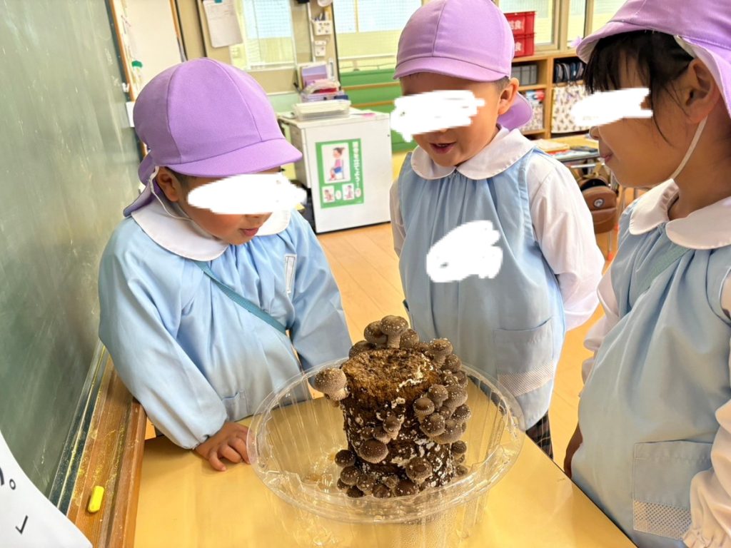 シイタケってこんな風に大きくなるんだね!と実際に目で見て、興味がでてきた子ども達✨