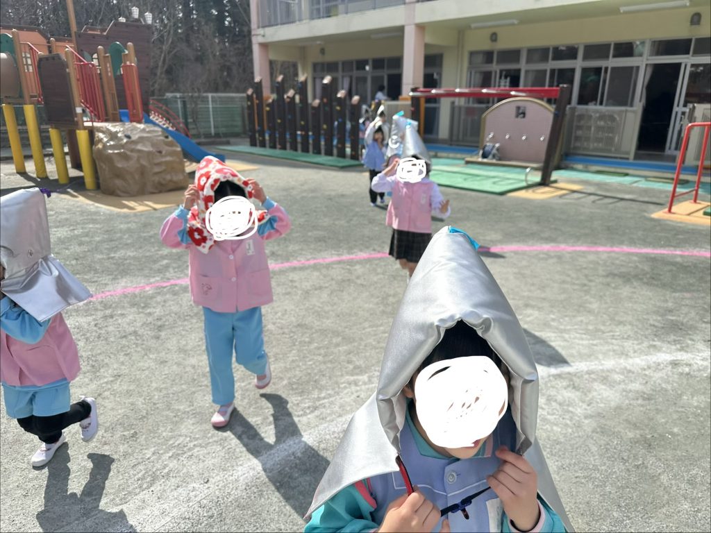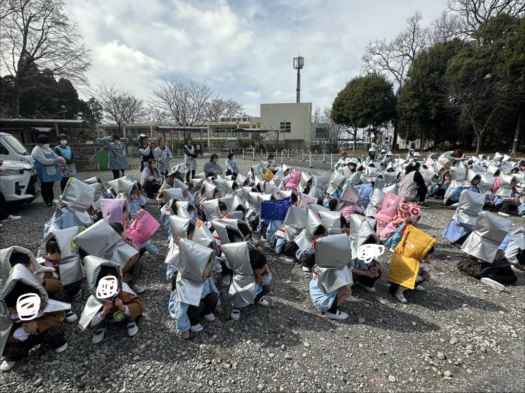机の下に潜ったり防災頭巾を被ったり、鼻と口を手で覆ったり…